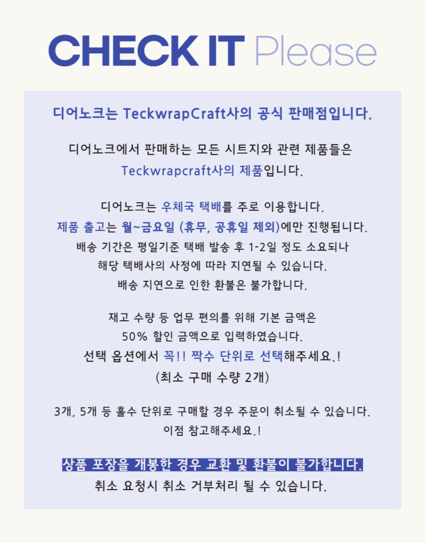 ❗재고 수량 등 업무 편의를 위해 기본 금액은 50% 할인 금액으로 표기되어 있습니다.